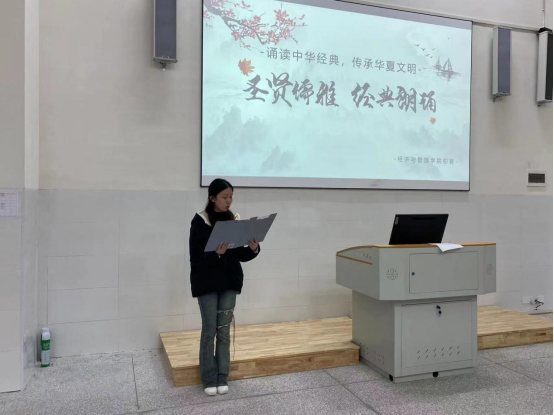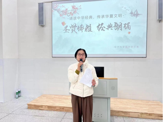 本次比赛邀请了数字经济管理学院院长徐四星教授和任丽教授作为评委,这不仅体现了本次比赛活动的重要性,更体现了院领导对学生素质与文化的重视。在本次活动结束之前,任丽教授为参赛选手点评出了他们朗通中的不足之处,让在座的学员们受益匪浅。