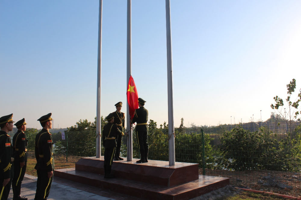 仪式第一项,升国旗,奏国歌。随着主持人的宣告,升旗仪式正式拉开帷幕。护旗队迈着整齐的步伐,护送着鲜艳的五星红旗迈向升旗台。在庄严激昂的国歌声中,五星红旗徐徐升起,迎风招展,全场师生庄严肃立,向国旗行注目礼,抒发对祖国的无限热爱与崇高敬意。